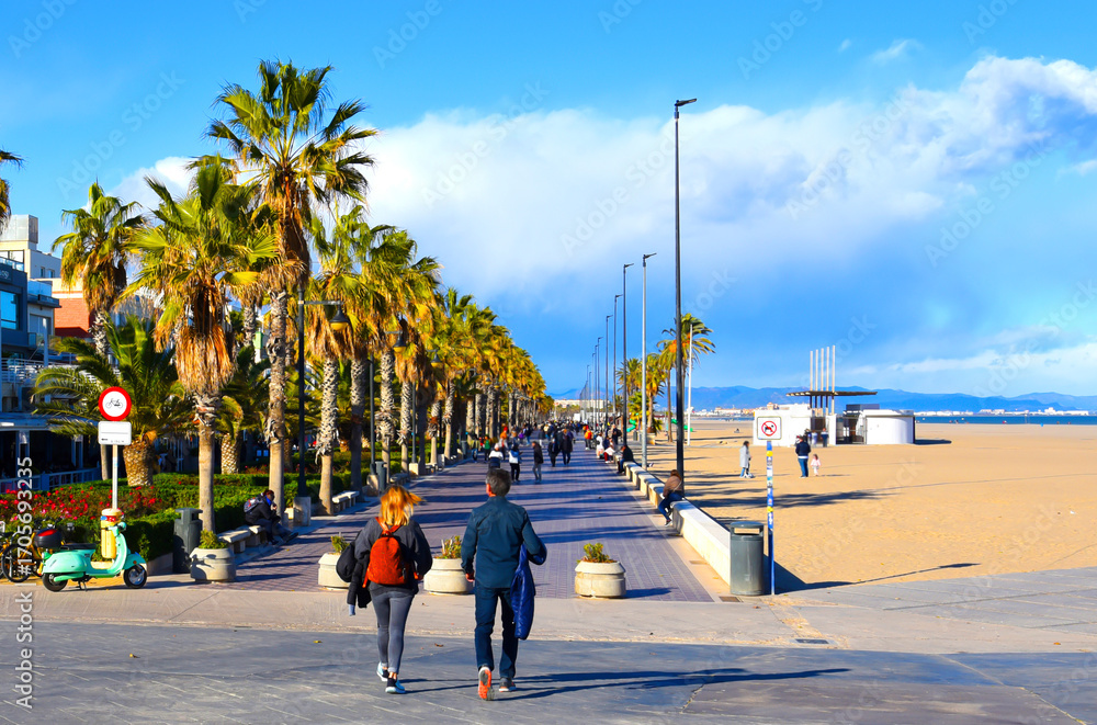 Samolepka People walk on path at coastline in autumn holiday season