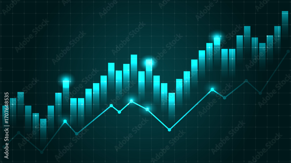 Samolepka Glowing blue financial chart with rising bars and line graph on dark grid backgr
