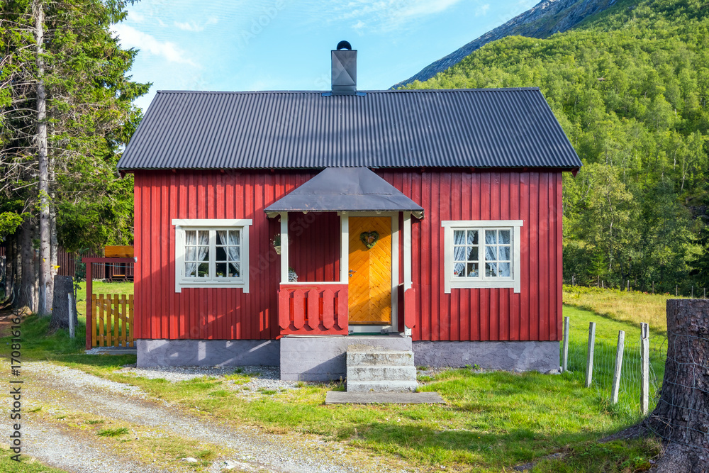 Samolepka Red cottage. Hill in background. Beautiful landscape. Norway