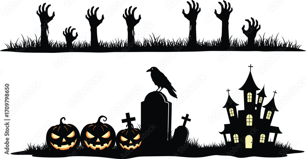 Samolepka Halloween zombie hands rising from graveyard with pumpkins, crow on tombstone, s