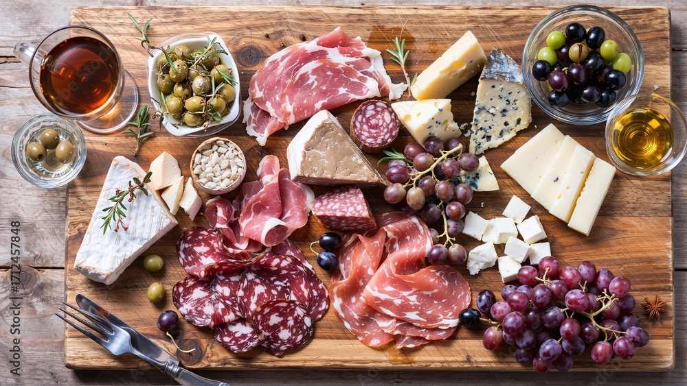 Samolepka A Rustic Feast: Delicious Assortment of Cheeses, Meats, Fruits, and Olives Arranged Artfully on a Wooden Cutting Board