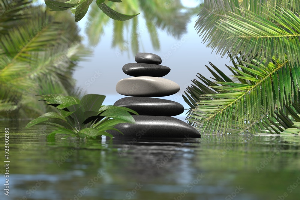 Samolepka Pyramid of stones against a green blurred background, 3D rendering