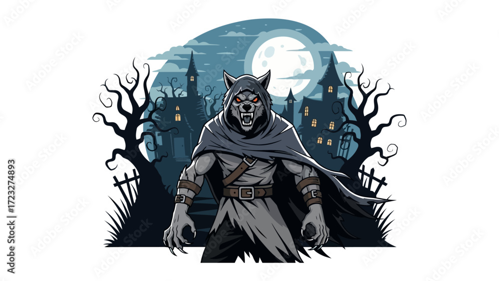 Samolepka Werewolf in the Eerie Night: A menacing werewolf figure stands silhouetted against a backdrop of gothic architecture and a luminous full moon, embodying the thrilling aura of the Halloween season