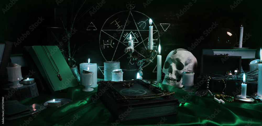 Samolepka Witchcraft composition with burning candles, human skull, magic sphere, books, jewelry, tarot cards, chalk and pentagram symbol