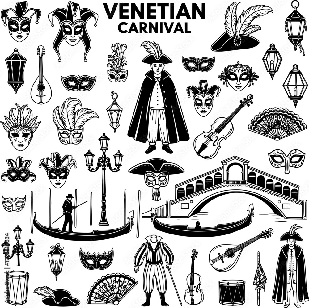 Samolepka Venetian Carnival Festival Elements Collection: Traditional Masks, Costumes, Gon