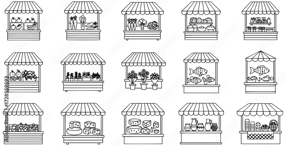 Samolepka Diverse market stalls showcase fresh produce, flowers, fish, and dairy products