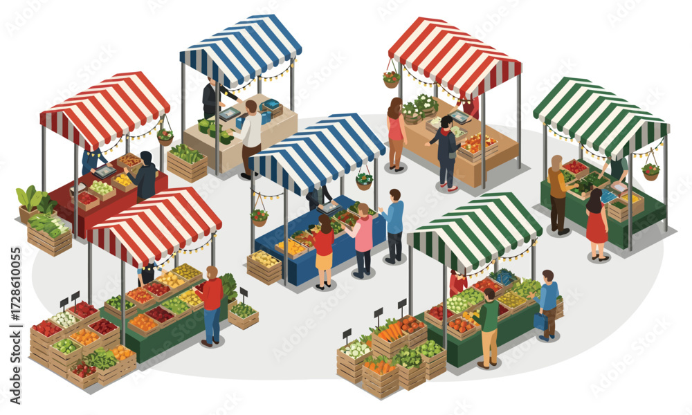 Samolepka Vibrant Market Stalls: An isometric illustration presents an lively market with various stalls and people interacting