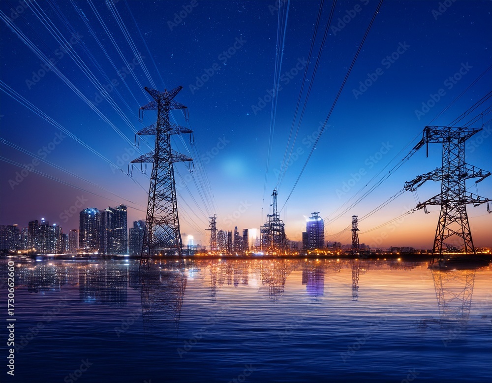 Samolepka night city skyline with power lines