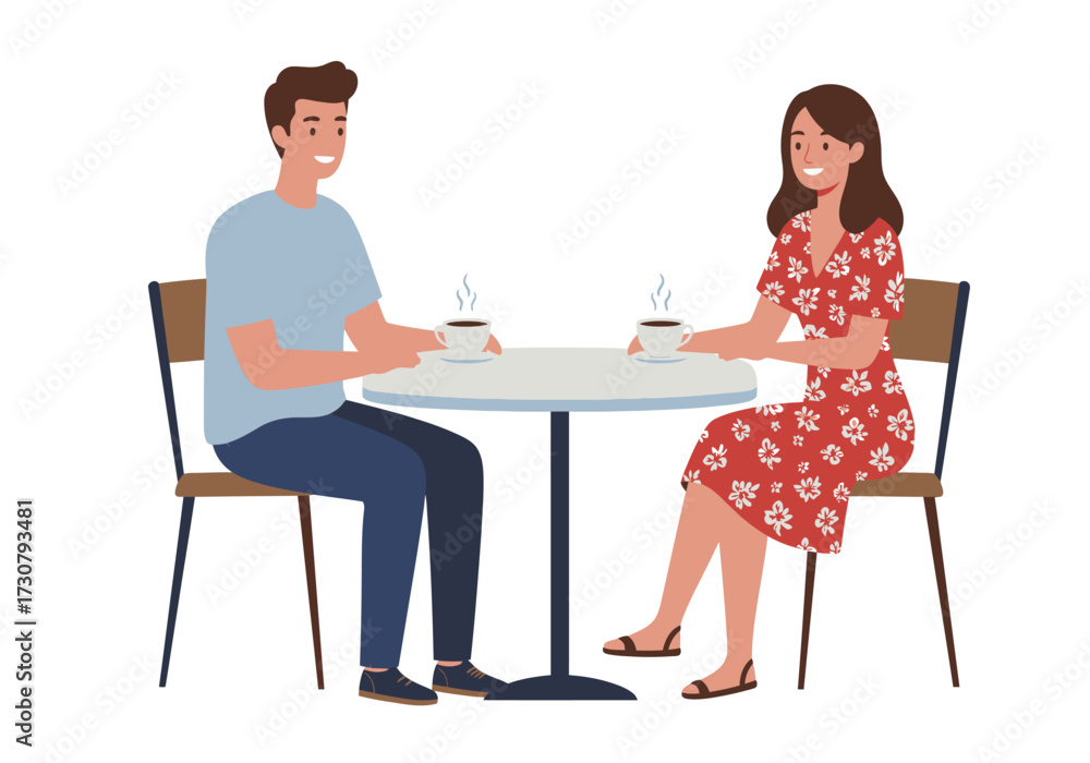 Samolepka Two people sit at a round table each with a cup of steaming coffee
