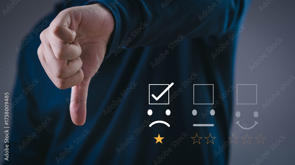 Samolepka Customer showing thumbs down with poor rating feedback icon, concept of negative review, dissatisfaction, low quality service, bad customer experience, business failure, online reputation management
