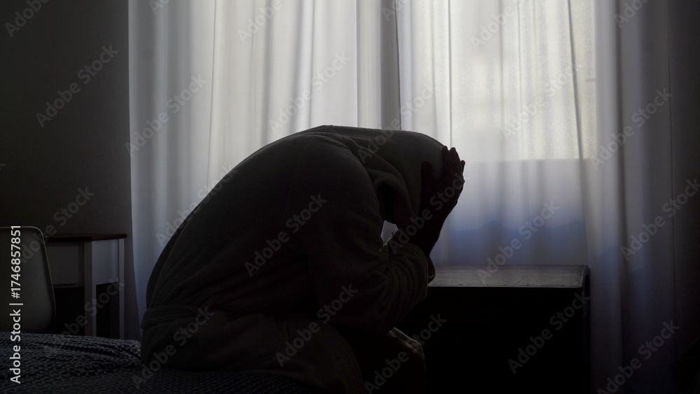 Samolepka Depressed man sitting on bed holding head grief pain crisis separation fatigue
