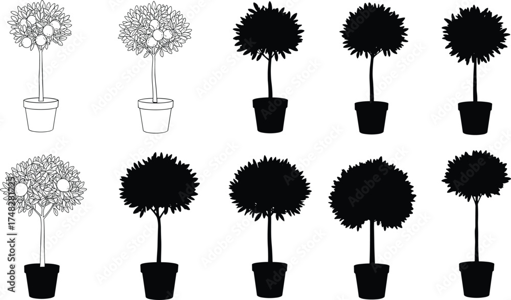 Samolepka Potted plant and topiary silhouette vector set, decorative indoor tree illustration, black and white gardening design, home decor botanical elements for vector art