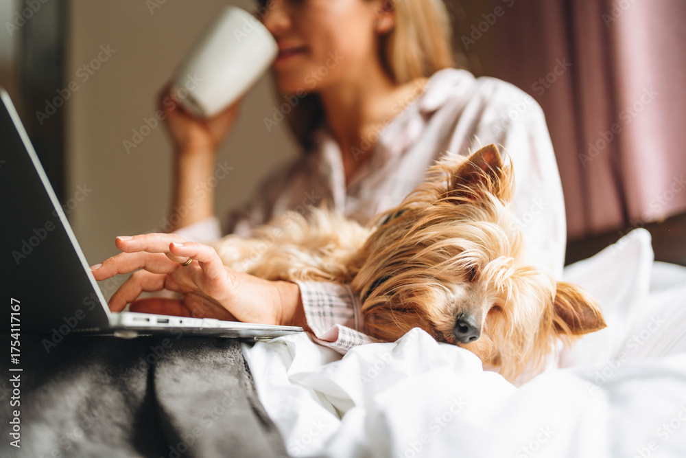Samolepka Woman enjoys quiet morning with coffee and dog while working on a laptop at home
