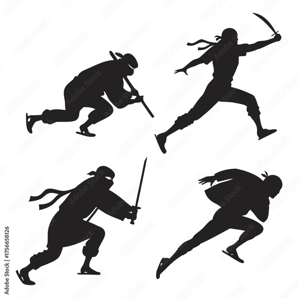 Samolepka Dynamic silhouettes of four ninjas in action poses featuring swords and a staff