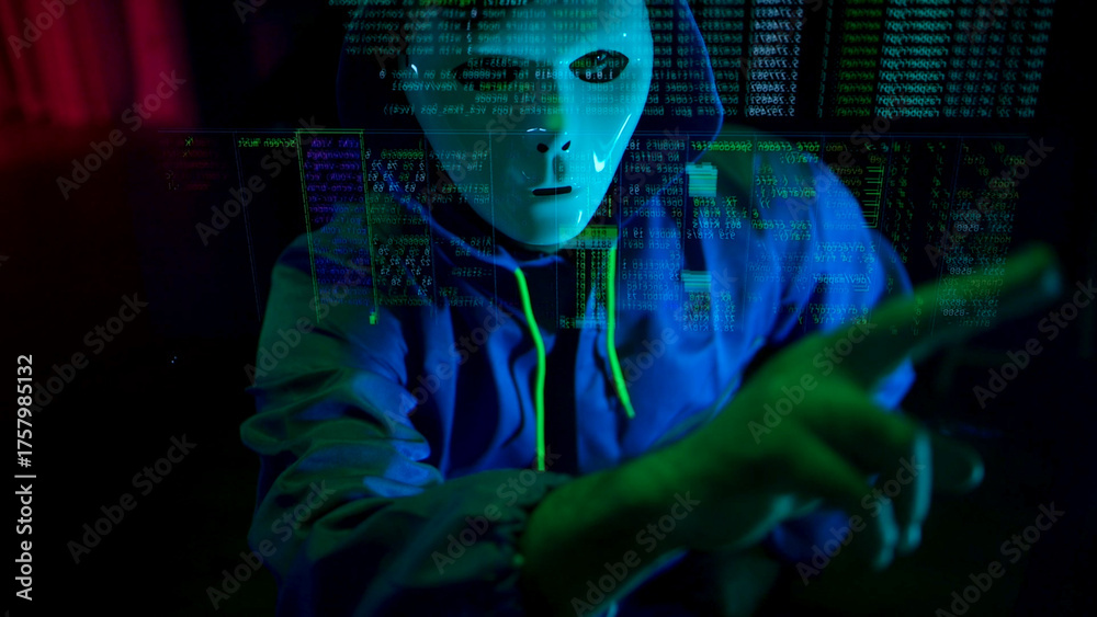 Samolepka Anonymous hacker wearing a mask and hoodie interacting with digital data in a da
