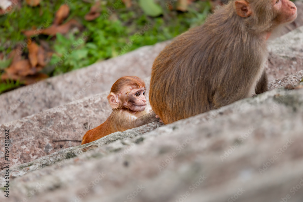 Samolepka Baby monkey follows mother on stone steps of Pashupatinath Temple