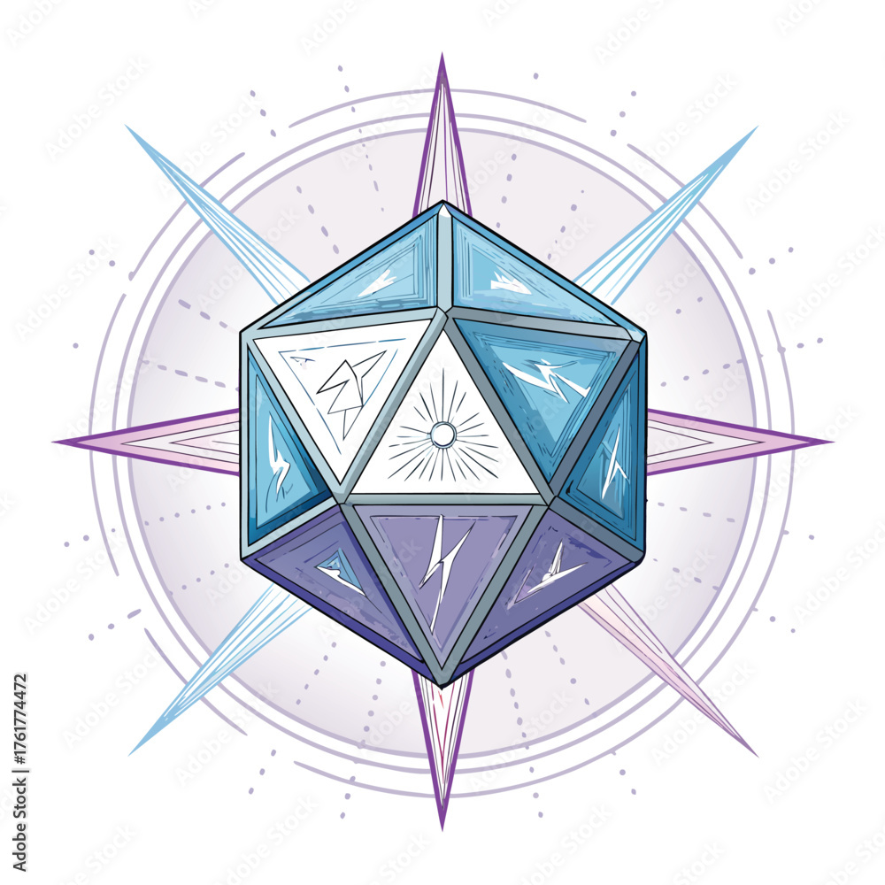 Samolepka A photorealistic vector illustration of a perfectly symmetrical, multifaceted, glossy, cube-shaped enigmatic entity, casting sharp, clean shadows on a neutral, subtle backdrop
