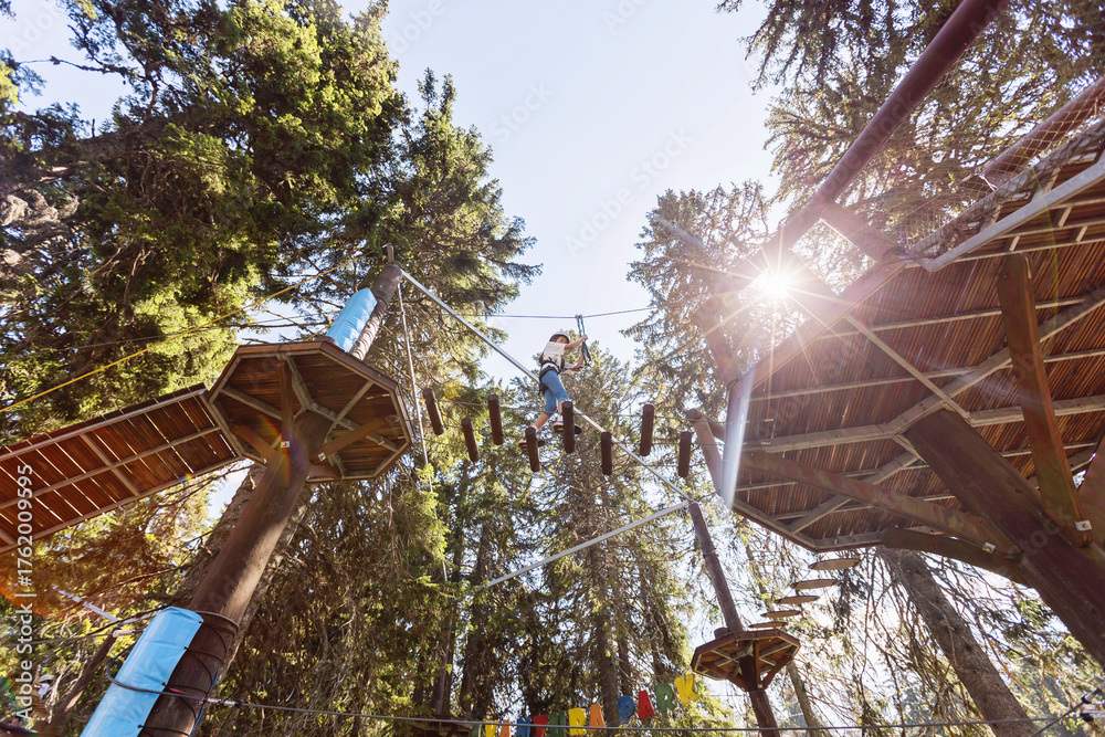 Samolepka Girl on aerial ropes course platform in treetop adventure park