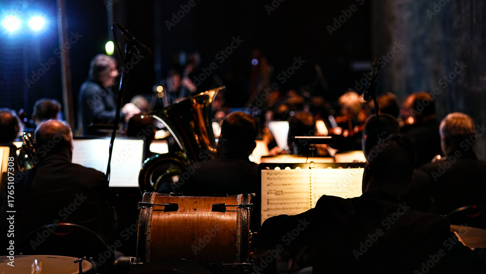 Samolepka Close up of classical orchestra performance featuring cello instrument in foregr