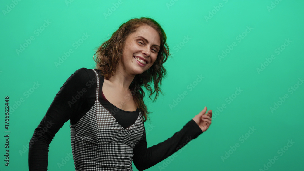 Samolepka Woman dancing happily with a joyful smile against a vibrant green background isolated from other elements in the scene, highlighting her youthful energy and carefree spirit