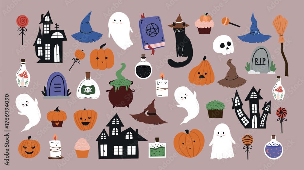 Samolepka Hand drawn Halloween clipart set with ghosts, pumpkins, cat, potions, and haunted houses