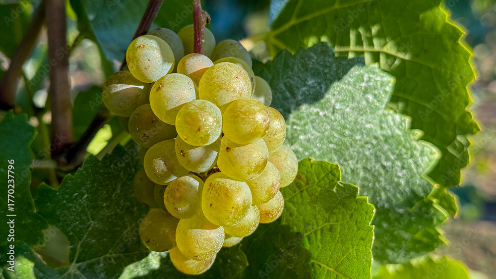 Samolepka Golden grapes glisten under sunlit foliage, evoking autumnal harvests and Bacchu