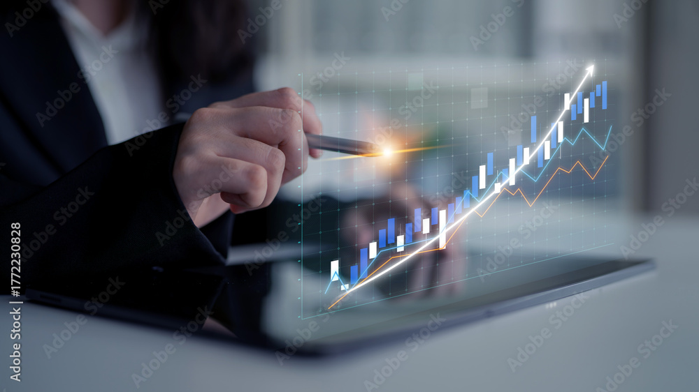 Samolepka A professional individual analyzes data on a tablet, showcasing digital graphs and charts that represent growth and financial performance in a modern workspace