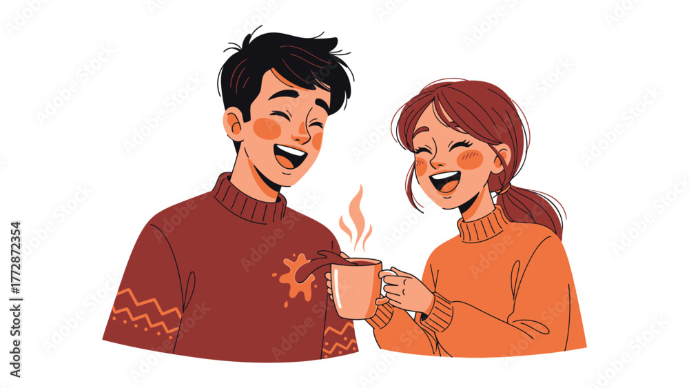 Samolepka Warm Shared Moment: A couple shares a warm beverage, their faces lit with shared laughter