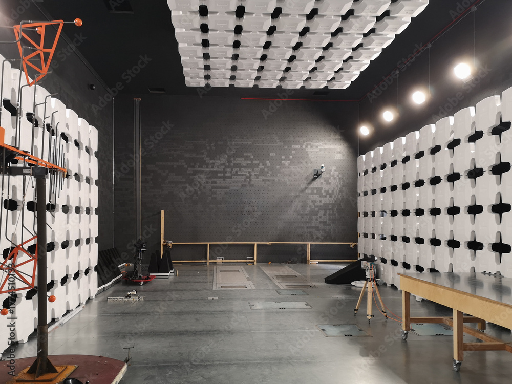Samolepka An interior view of a 10-meter EMC anechoic chamber, showcasing the specialized antenna setup used for electromagnetic compatibility testing