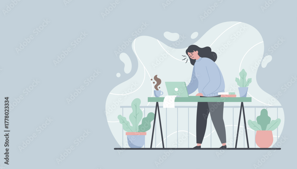 Samolepka Unwell woman struggles to work remotely from home office due to illness or burno