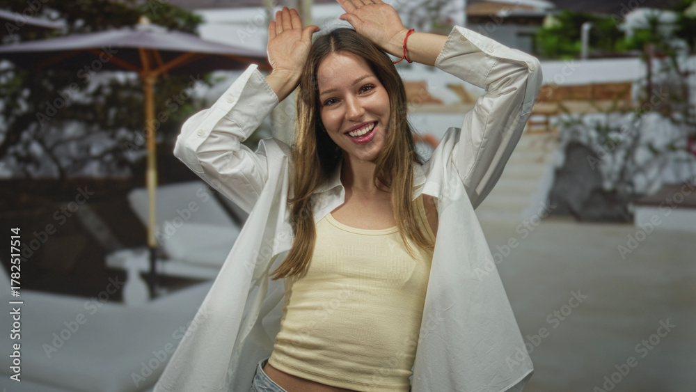 Samolepka Woman laughing with hands raised and tongue out on street by pool umbrella and steps; joyful carefree fun