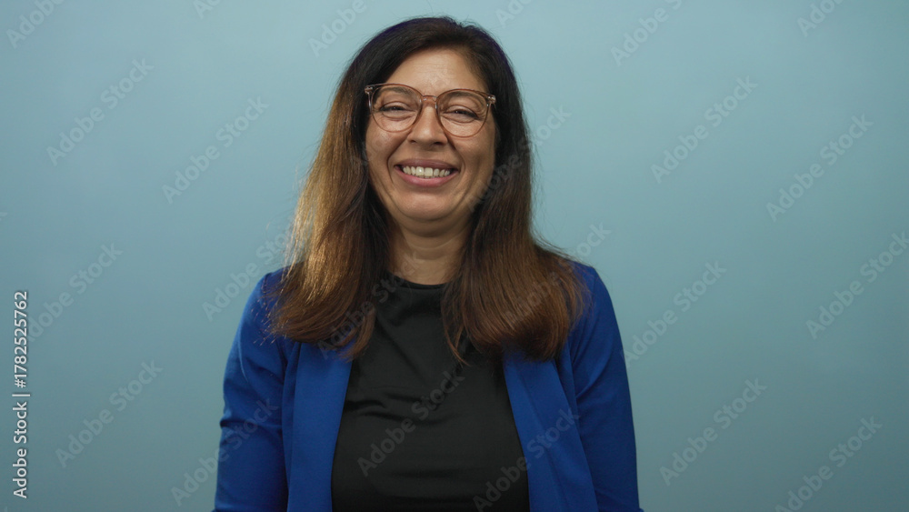 Samolepka Middle aged hispanic woman wearing glasses pointing finger to camera in studio against light blue wall; joy