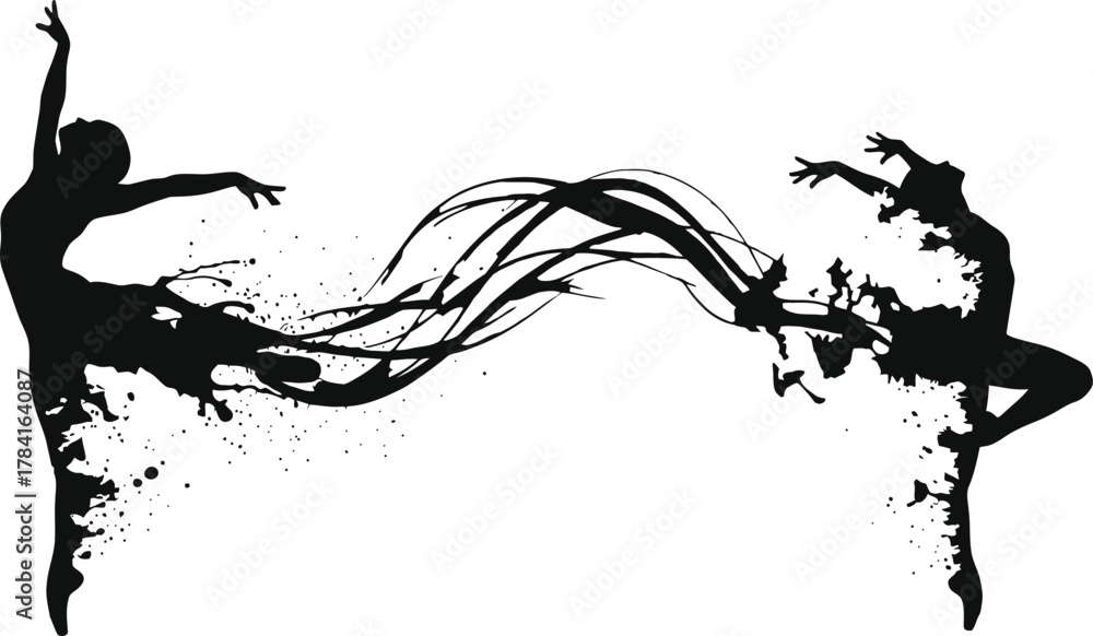 Samolepka Fluid dance silhouettes, abstract ink splash dancers connected by flowing ribbons, expressive movement, contemporary art vector, black and white composition