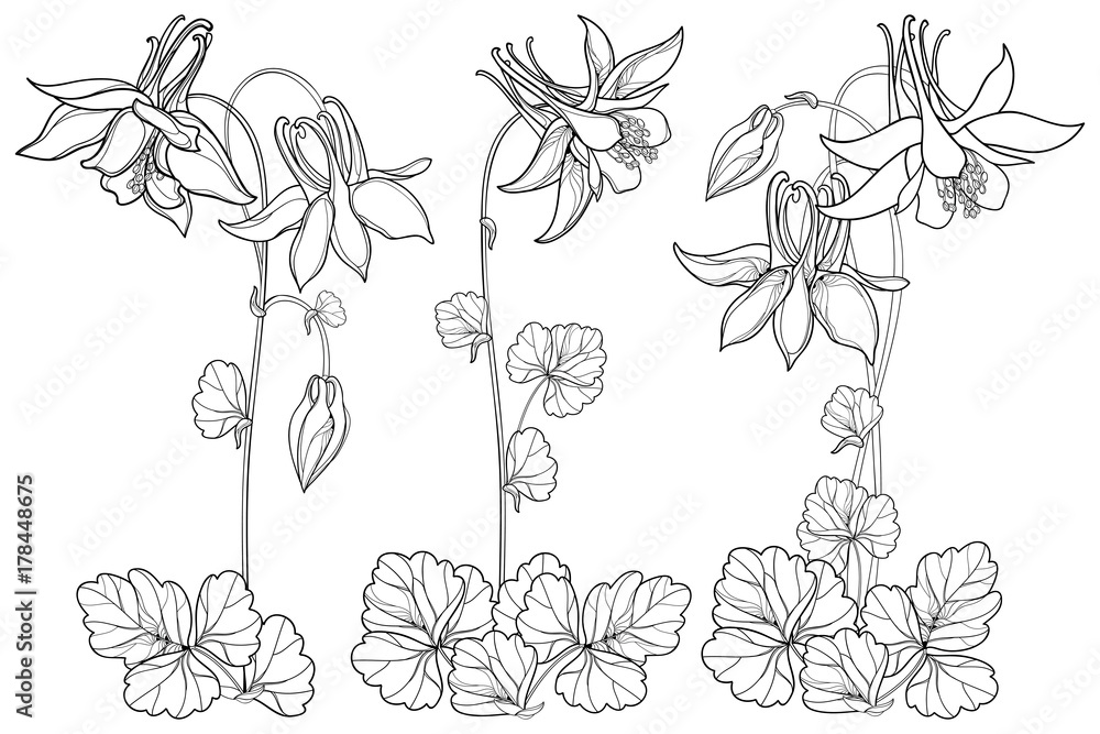 Samolepka Vector set with outline ornate Aquilegia or Columbine flower, bud and foliage in black isolated on white background