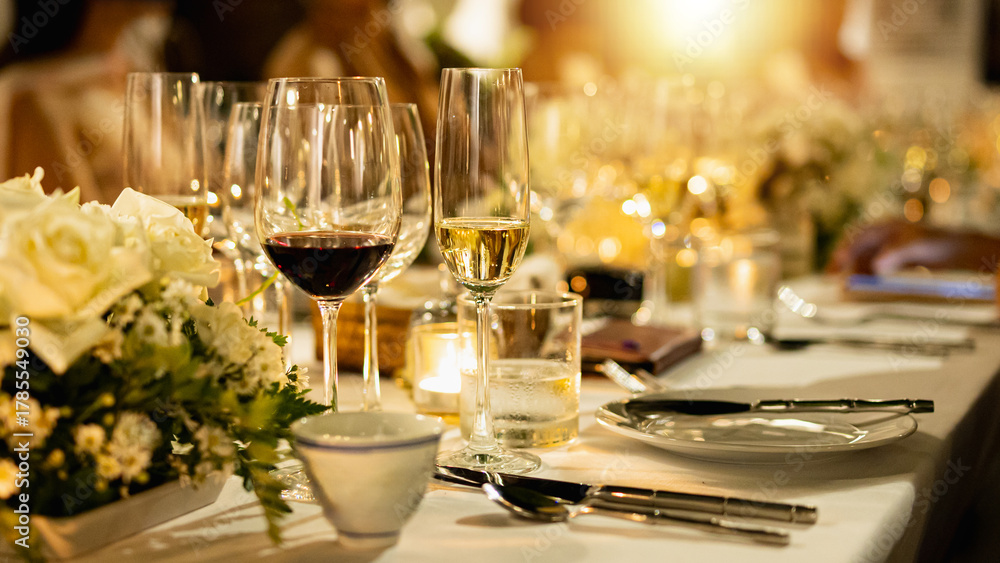Samolepka Red and white wine glasses on a beautifully set table, Fine dining and wine, Luxury table setting