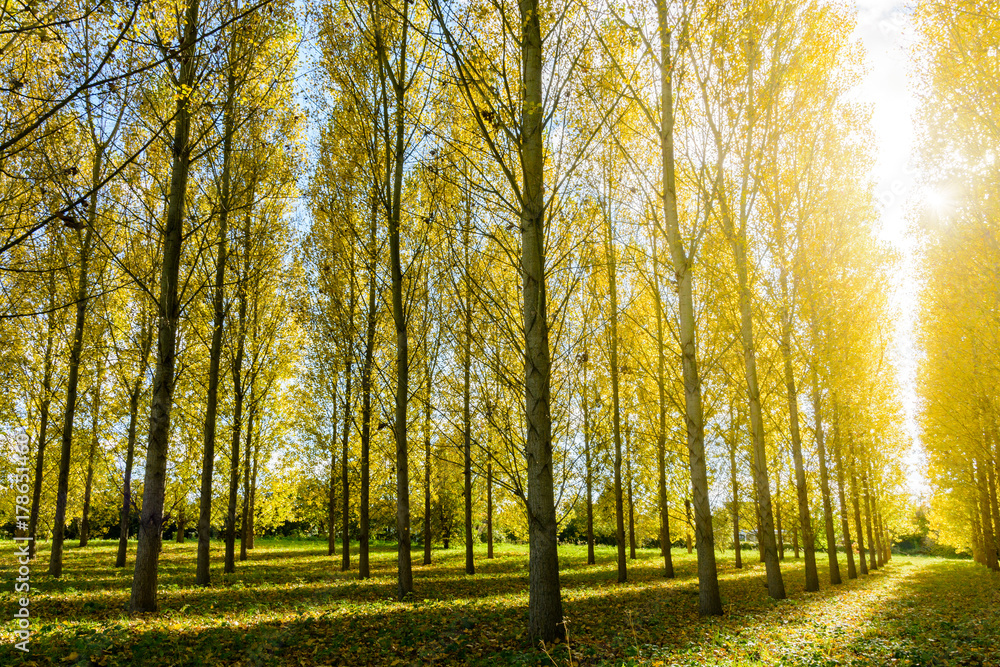 Samolepka The yellow foliage of a poplar grove is illuminated by a dazzling autumnal sunshine in a residential area