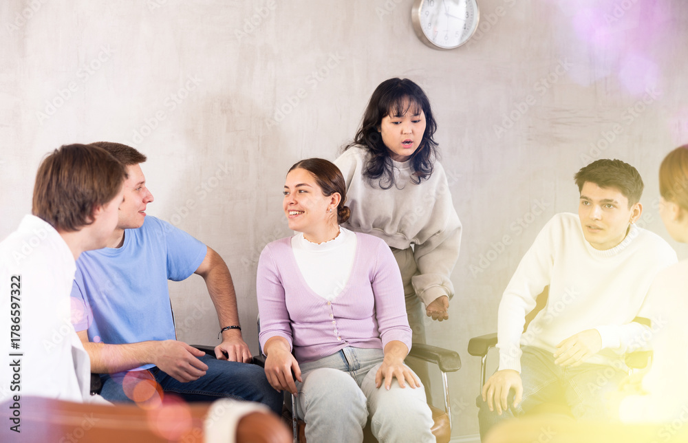 Samolepka Group of cheerful carefree young students relaxing and chatting amicably during