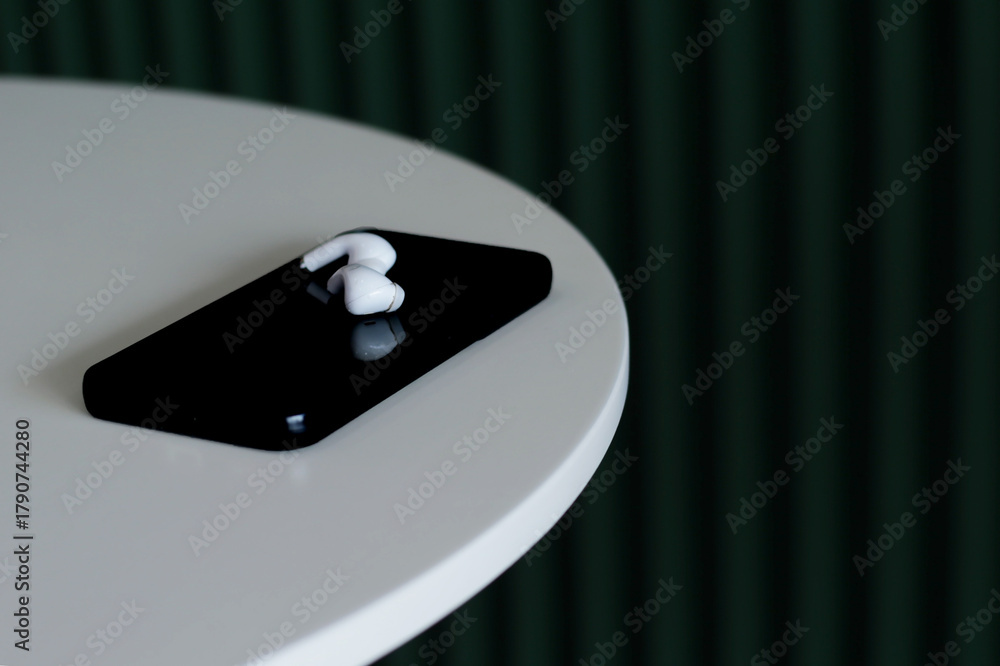 Samolepka Smartphones and wireless headphones are placed on the leisure lifestyle table