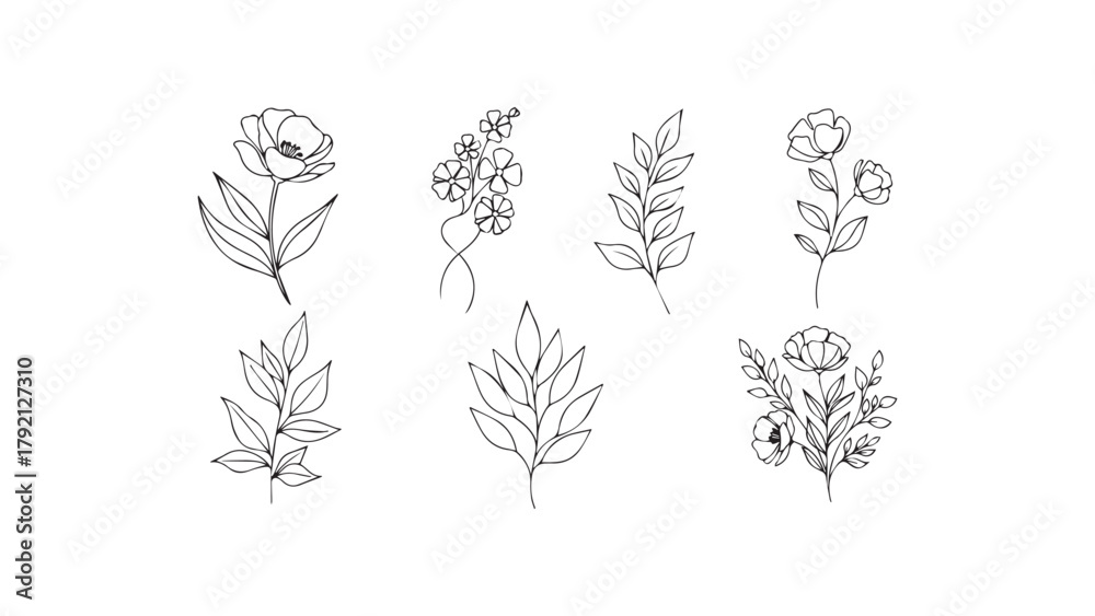 Samolepka A collection of five minimalist botanical illustrations, each featuring a unique arrangement of flowers, leaves, and stems drawn in a continuous line art style