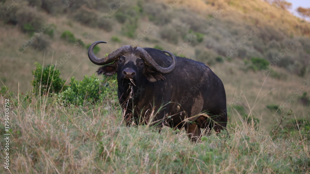Samolepka Close-up portrait of a majestic African buffalo in its natural habitat, highlighting its strength and presence