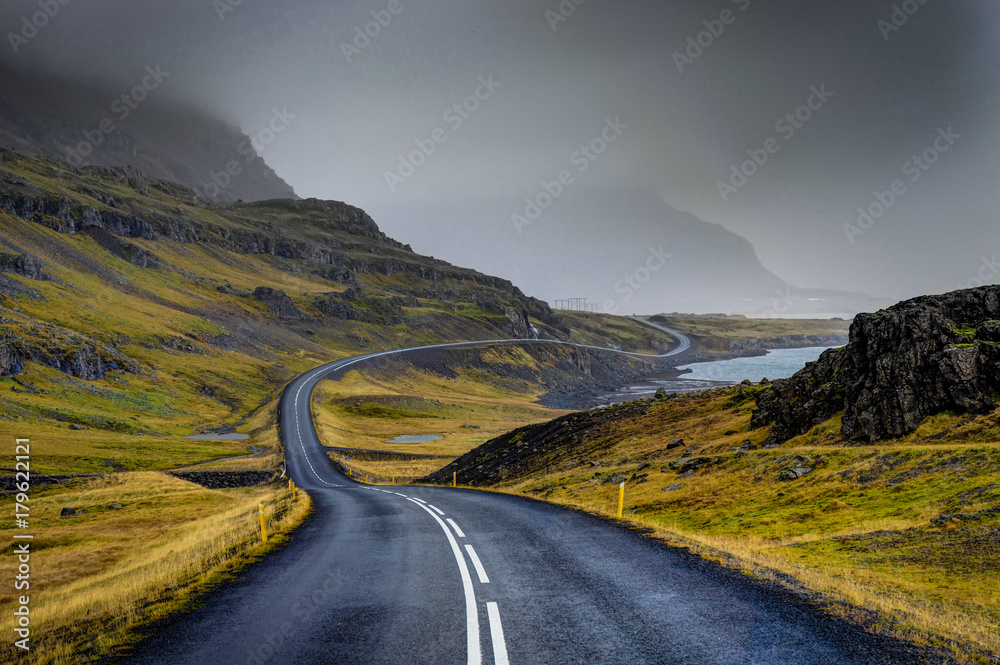 Samolepka Empty Street with Icelandic Landscape during with misty mountain