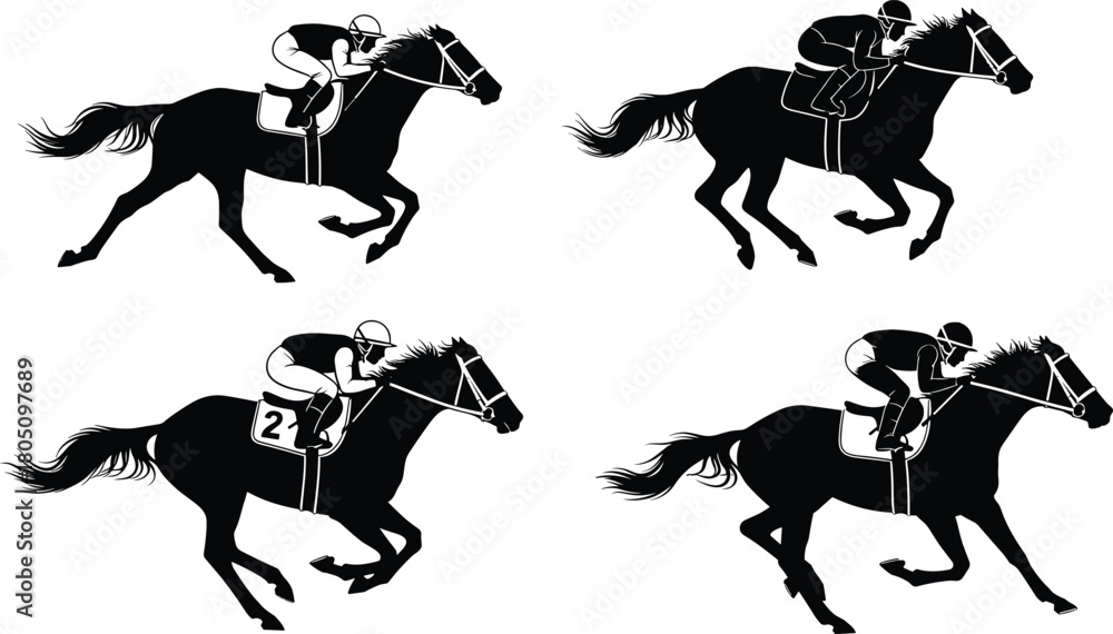 Samolepka Set of black silhouette vector illustrations of jockeys riding galloping race horses, competing in a fast professional equestrian sport