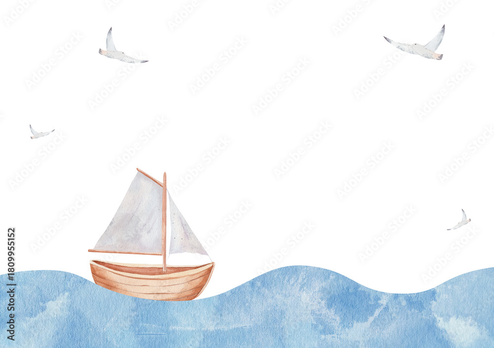 Samolepka Watercolor template with wooden sailboat sailing on ocean waves