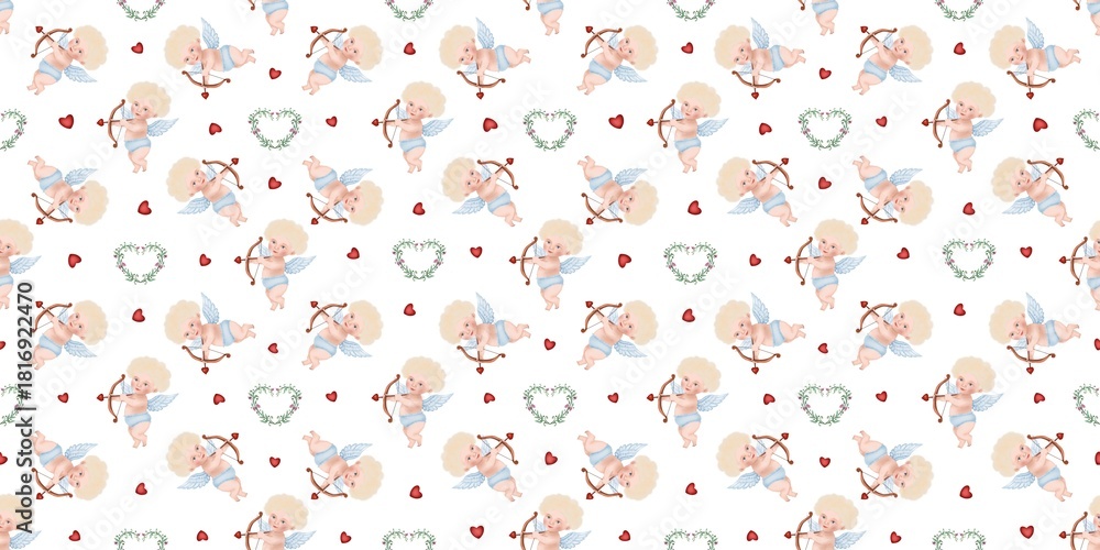 Samolepka Seamless watercolor pattern with adorable baby cupids, red hearts, and floral wreaths
