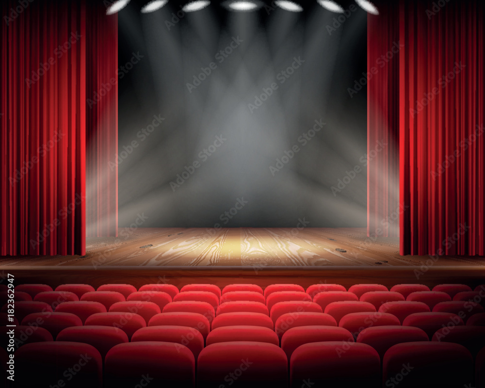 Samolepka Open red curtain and empty illuminated theatrical scene realistic vector illustration