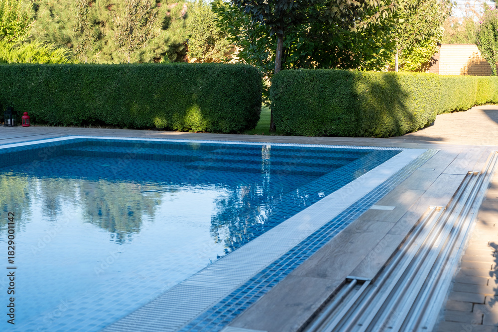 Samolepka Swimming pool featuring blue mosaic tiles and an automatic cover mechanism, refl