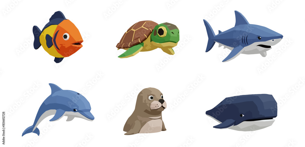 Samolepka Marine animals set illustration geometric style isolated on black background