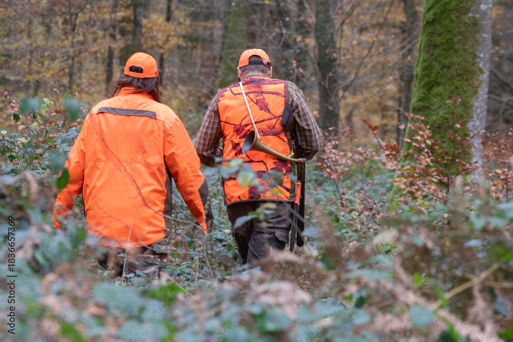 Samolepka Deux chasseurs traqueurs en tenue fluo marchant en forêt pendant une battue