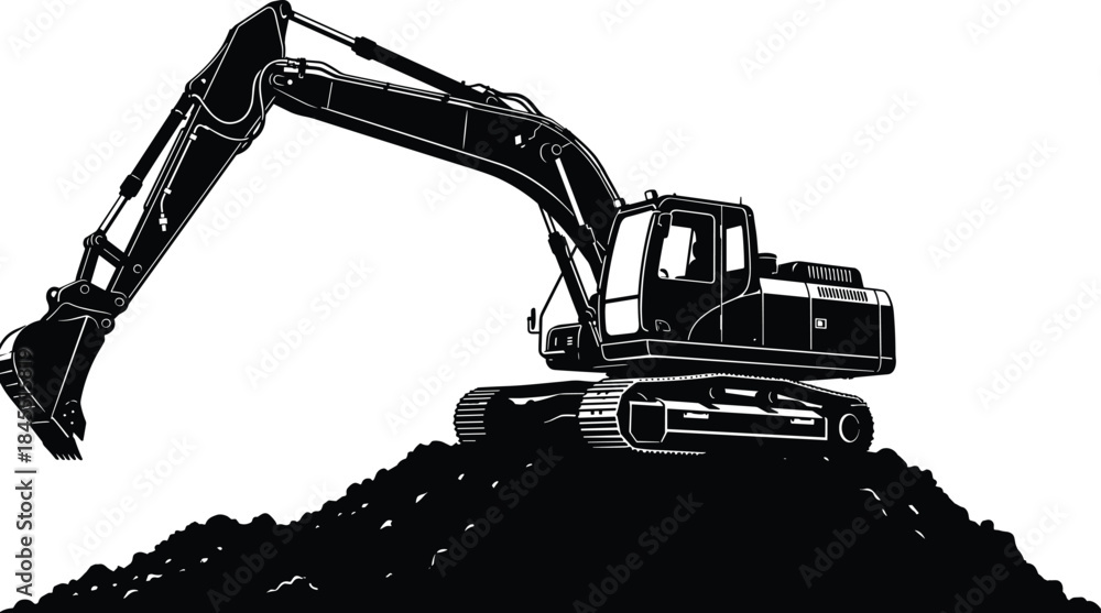 Samolepka Silhouette of a heavy excavator machine working on a dirt mound, construction equipment performing digging operations on a job site in industrial settings