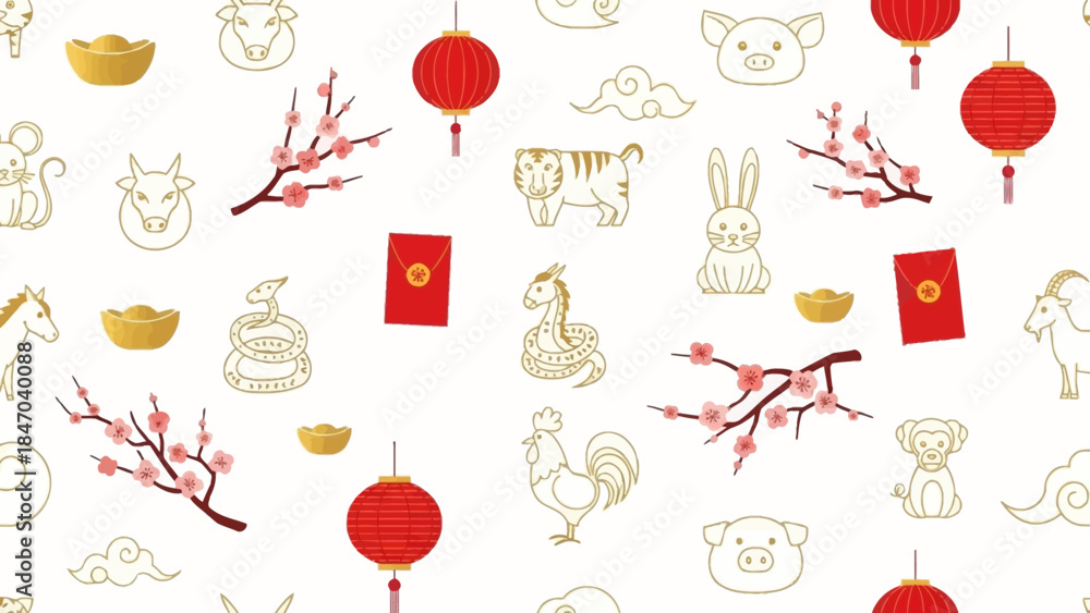 Samolepka Seamless Chinese New Year Pattern with Zodiac Symbols and Lanterns